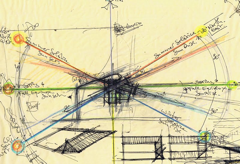 - The volumes of the structure are oriented on a 30° axis and correspond to the Summer Solstice, Equinox, and Winter Solstice for the site’s latitude. Orienting the home towards these specific calendar dates will create sun-beam events within the home as though the home is an inside-out sun-dial.